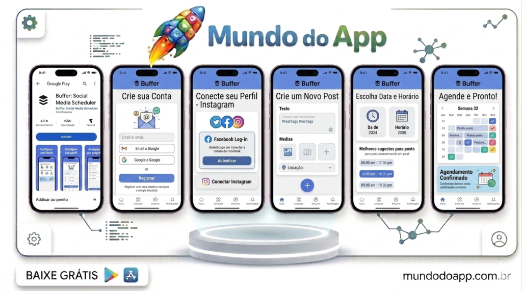 O app Buffer (Android e iOS) é uma das melhores opções de aplicativo para agendar posts no Instagram grátis. A combinação de uma interface simples, calendário visual, publicação automática e suporte a múltiplas plataformas o coloca à frente de grande parte das ferramentas disponíveis no mercado.