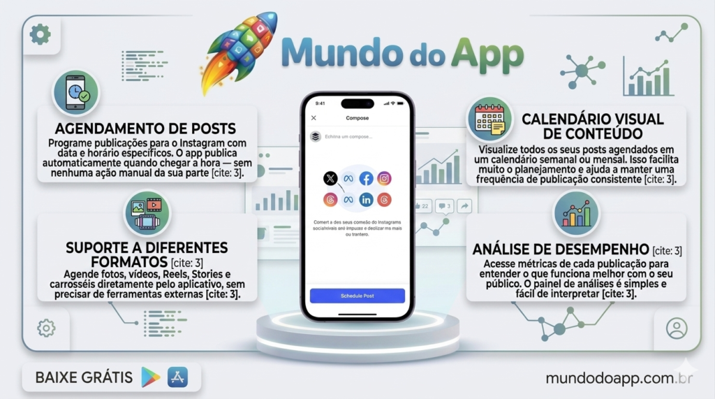 Principais funcionalidades do aplicativo para agendar posts no Instagram grátis